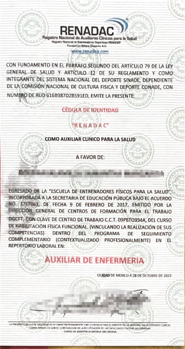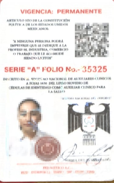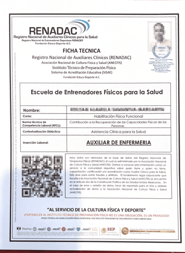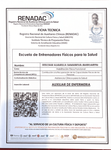 Se conforma por un número de control, fotografía, nombre completo y profesionalización. Se da de alta en renadep.com®, para verificar la autenticidad del documento oficialmente registrado en: RENADAC ® (Registro Nacional de Auxiliares Clínicos).
