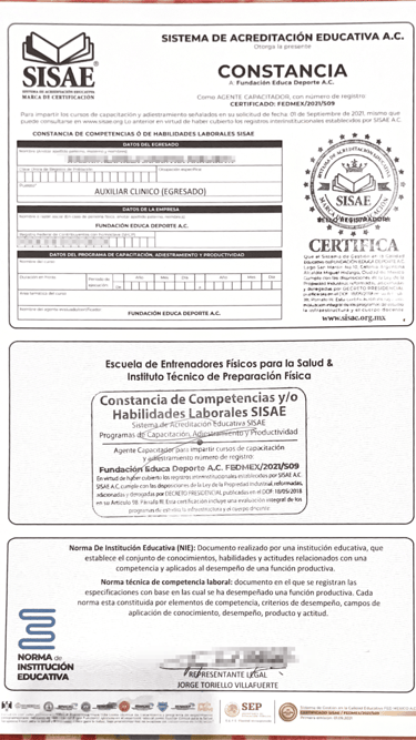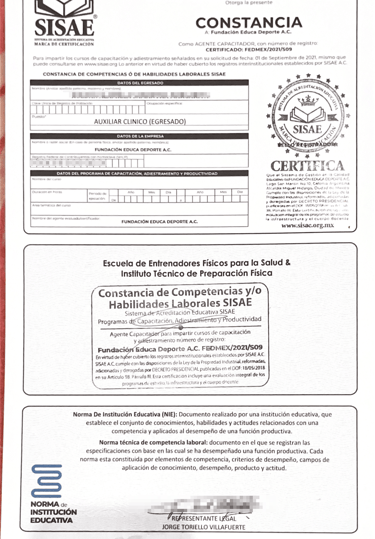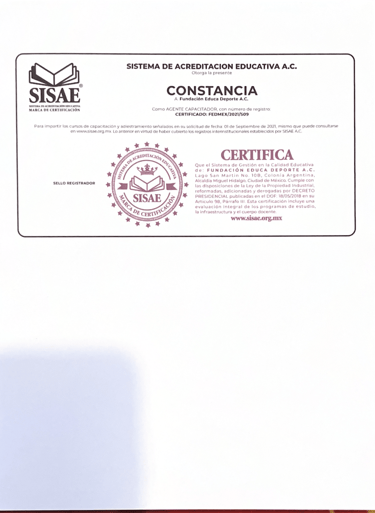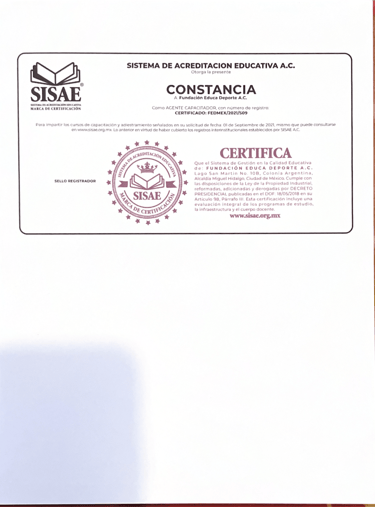 Es la constancia de competencia laboral avalada por el Sistema de Acreditación Educativa (SISAE) que nos reconoce como agente capacitador externo.