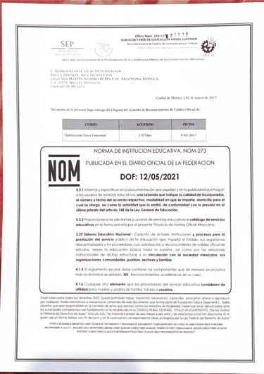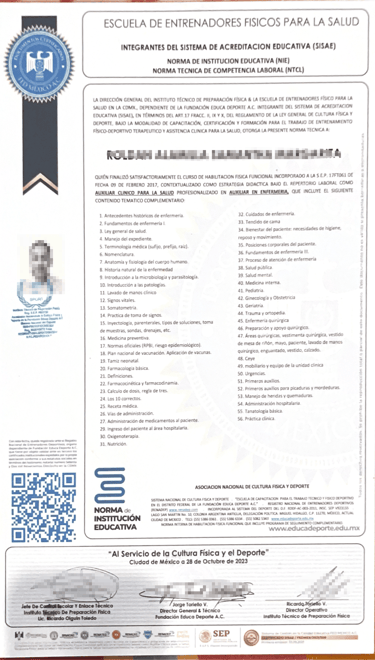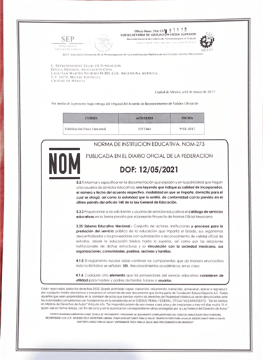 En la parte trasera podemos visualizar la Constancia Interna S.E.P., el acuerdo de incorporación por medio de la Dirección General de Centros de Formación para el Trabajo (DGCFT) que es quien a través de la S.E.P. otorga el RVOE institucional a la Escuela de Ciencias Físicas para la Salud Educa Deporte.
